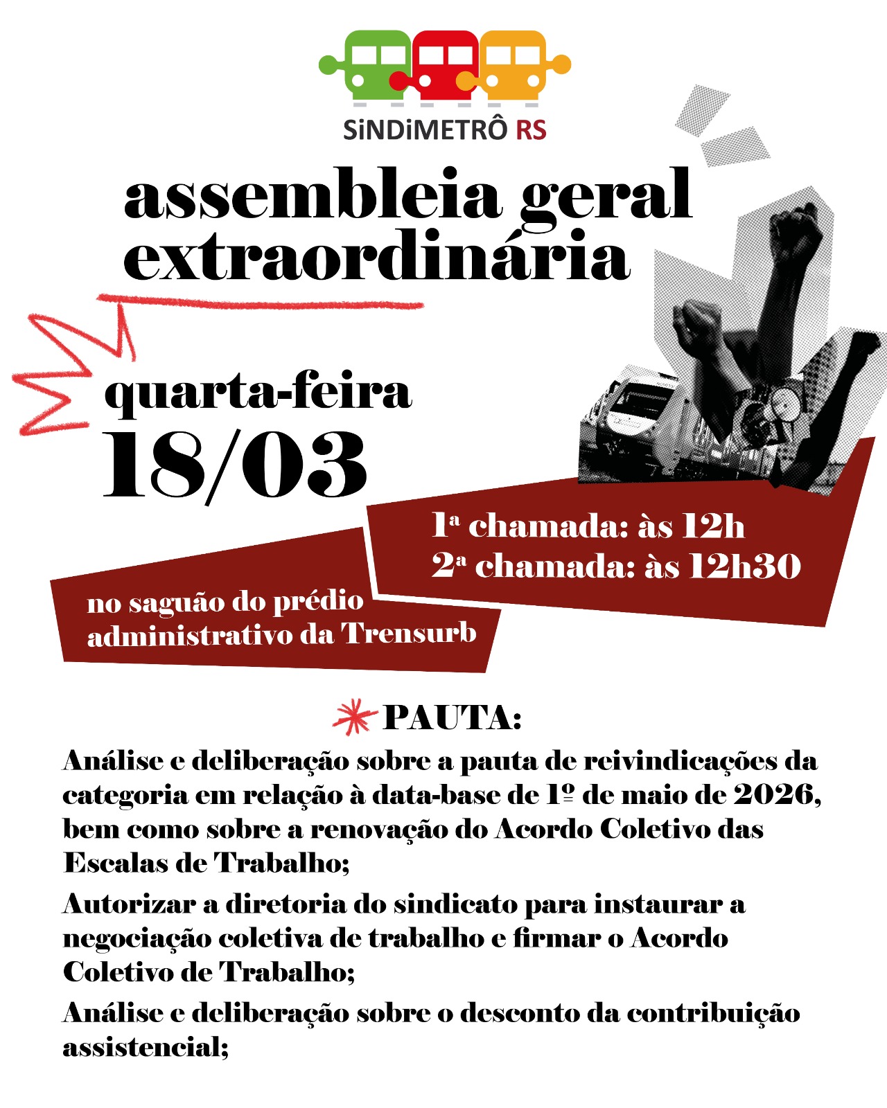 Na próxima quarta, 18, damos mais um passo em mobilização para a garantia dos nossos direitos e pelo futuro da Trensurb Pública. Estaremos reunidos no saguão do prédio administrativo da Trensurb para realizar assembleia geral extraordinária.