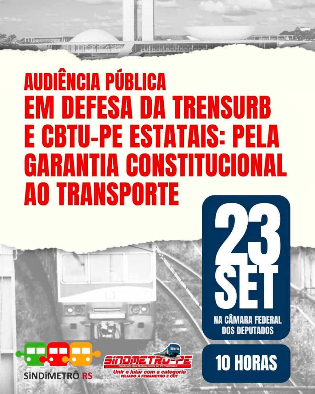 No dia 23 de setembro, estaremos em Brasília para a audiência pública em defesa da Trensurb e CBTU-PE estatais: pela garantia constitucional ao transporte, que ocorrerá às 10 horas na Câmara Federal dos Deputados.