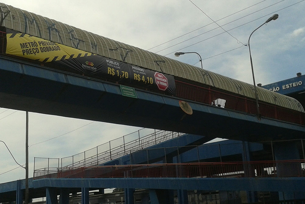 Dia de abertura da Expointer. Dia de luta contra a privatização da Trensurb. Os metroviários começaram o sábado (27) abrindo uma faixa na passarela de acesso à feira de exposição, junto à estação Esteio da Trensurb.