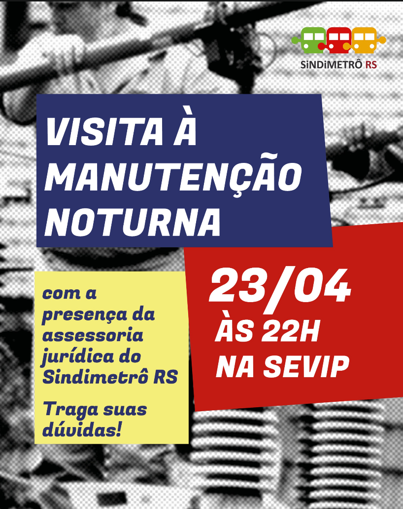 Nesta quinta-feira, 23, a diretoria do Sindimetrô RS vai até o setor da manutenção noturna para dialogar com a categoria. A visita conta com a presença da assessoria jurídica do sindicato e começa às 22h, na SEVIP.